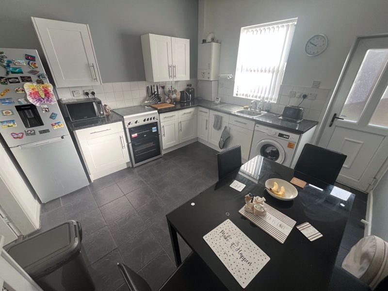 UPVC Double glazed door to rear, fitted base, wall units, stainless steel sink unit, cooker point, plumbed for automatic washing machine, double radiator